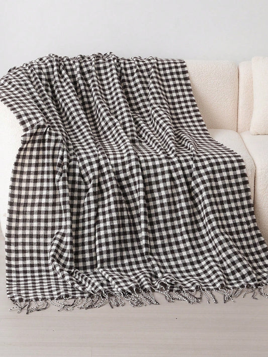 1pc Rectangular Dual-Tone Plaid Woven Sofa Blanket, Casual Polyester Fringe Throw Blanket Suitable For Office Nap, Daily Use